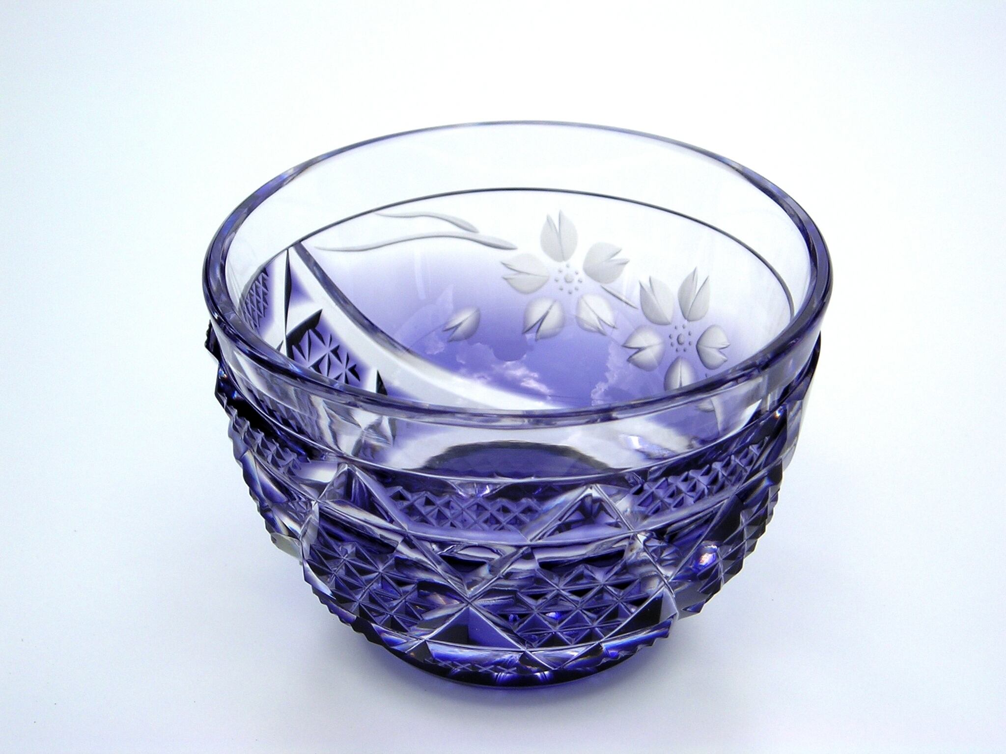作家 頌峰(しょうほう)によるこの作品は、贅沢な桜の花が咲き誇る「花やか」︰紫の薩摩切子です。透明と、深みのある紫色とのグラデーションが施された、華やかな逸品です。